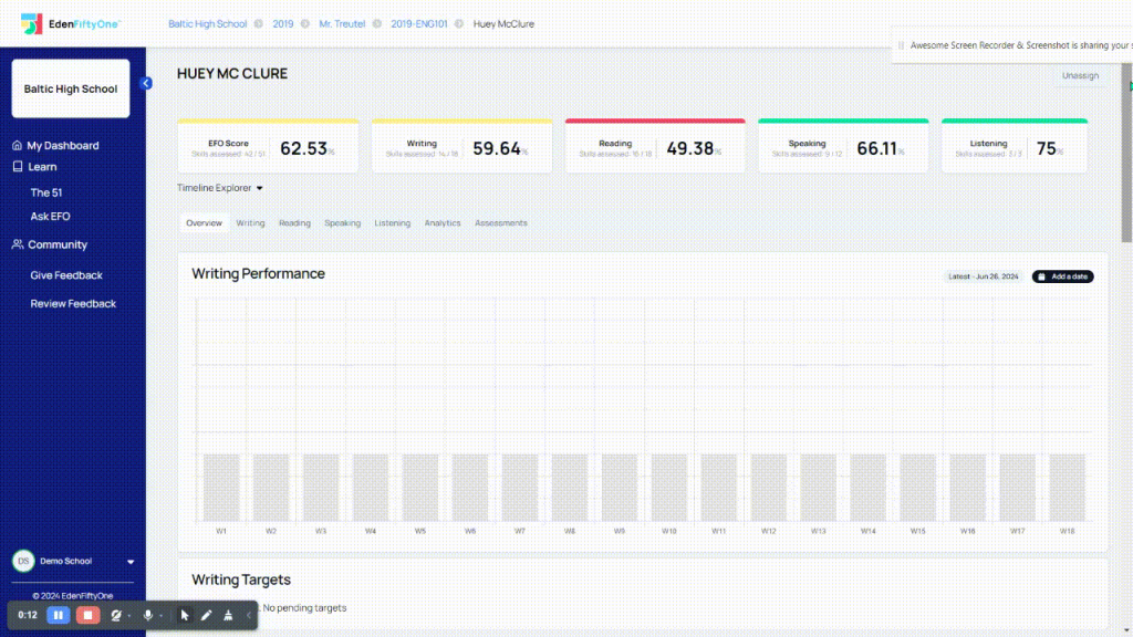 the EdenFiftyOne® [EFO] platform uses a simple traffic-light system to promote proficiency and progress across 51 universal skills of reading, writing, speaking and listening